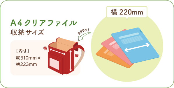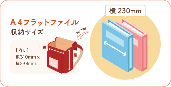 「A4フラットファイル」サイズのランドセルは、教科書やノート、「A4フラットファイル」がスッキリ入るサイズです。