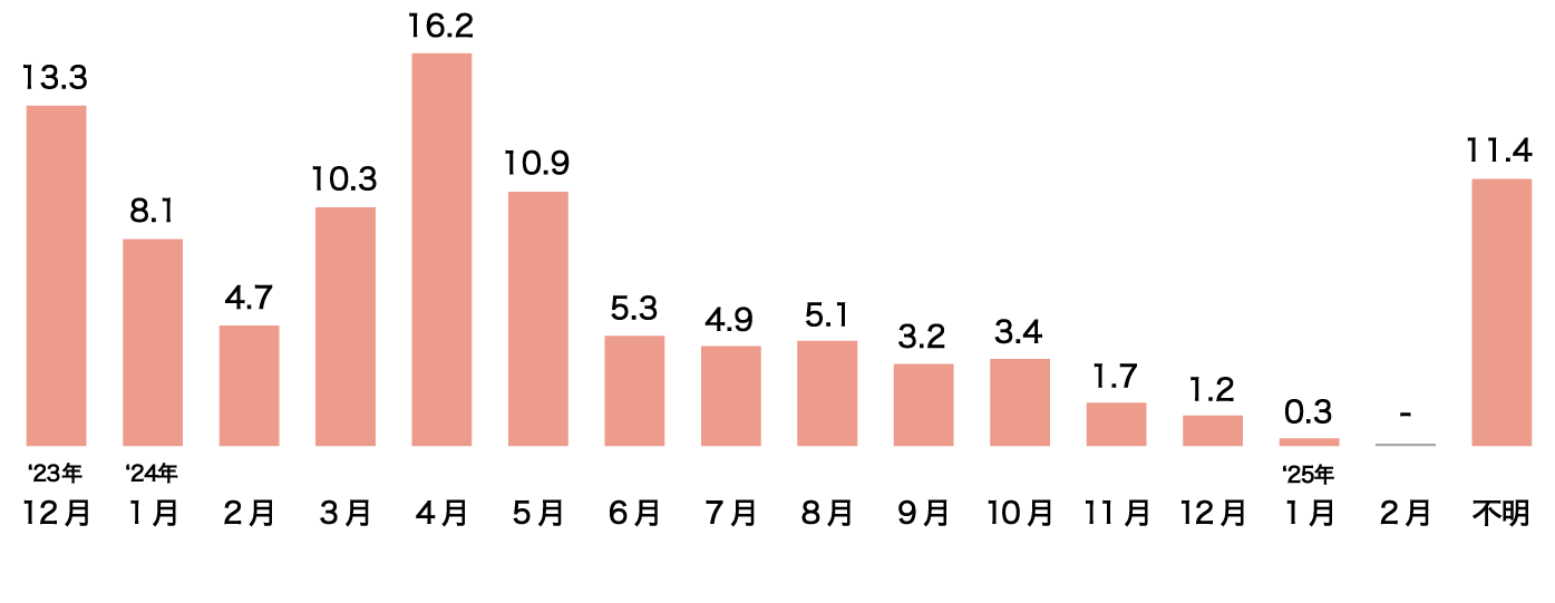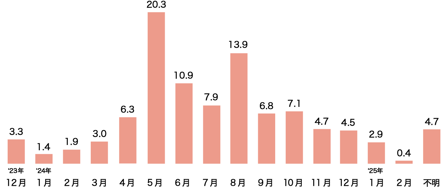 例年同様に検討開始時期としては 4月がピークで、1~3月期も若干増加しており早期化の傾向が続く形となりました。 例年のボリュームゾーンである12月、4月、5月のスコアはやや減少しました。
