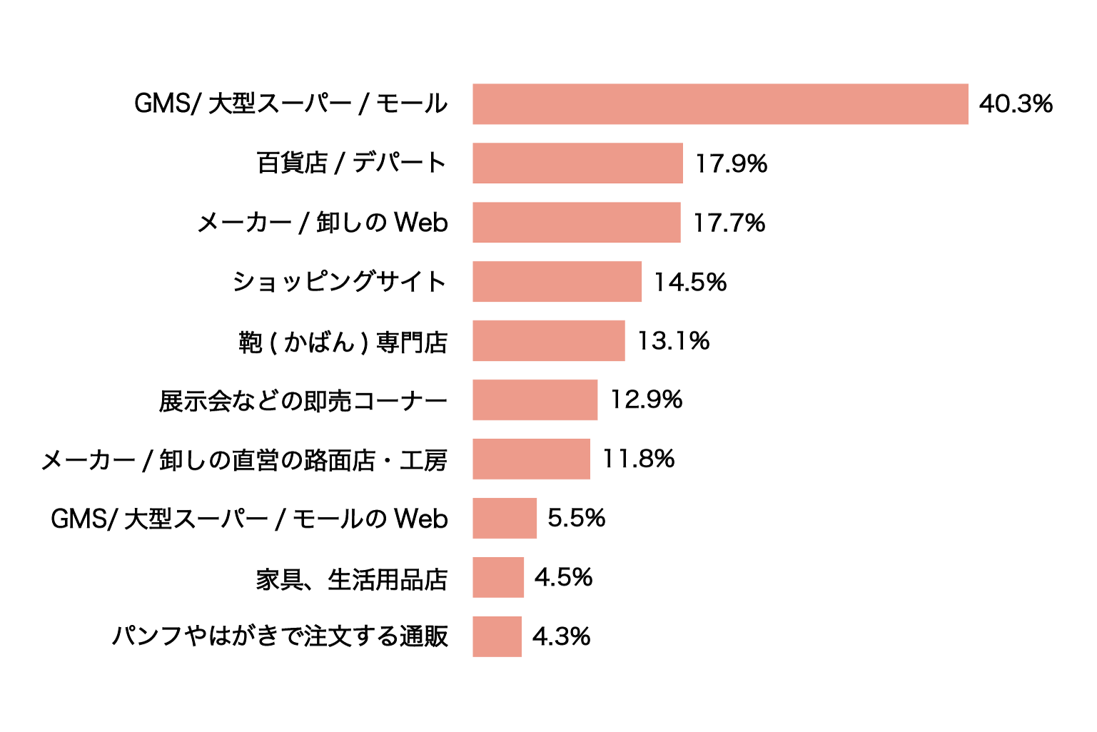 「GMS/大型スーパー/モール」は、購入した場所で前年同様にトップとなりました。「鞄(かばん)専門店」は購入した店舗として引き続き2位となりましたが、年々減少傾向にあります。