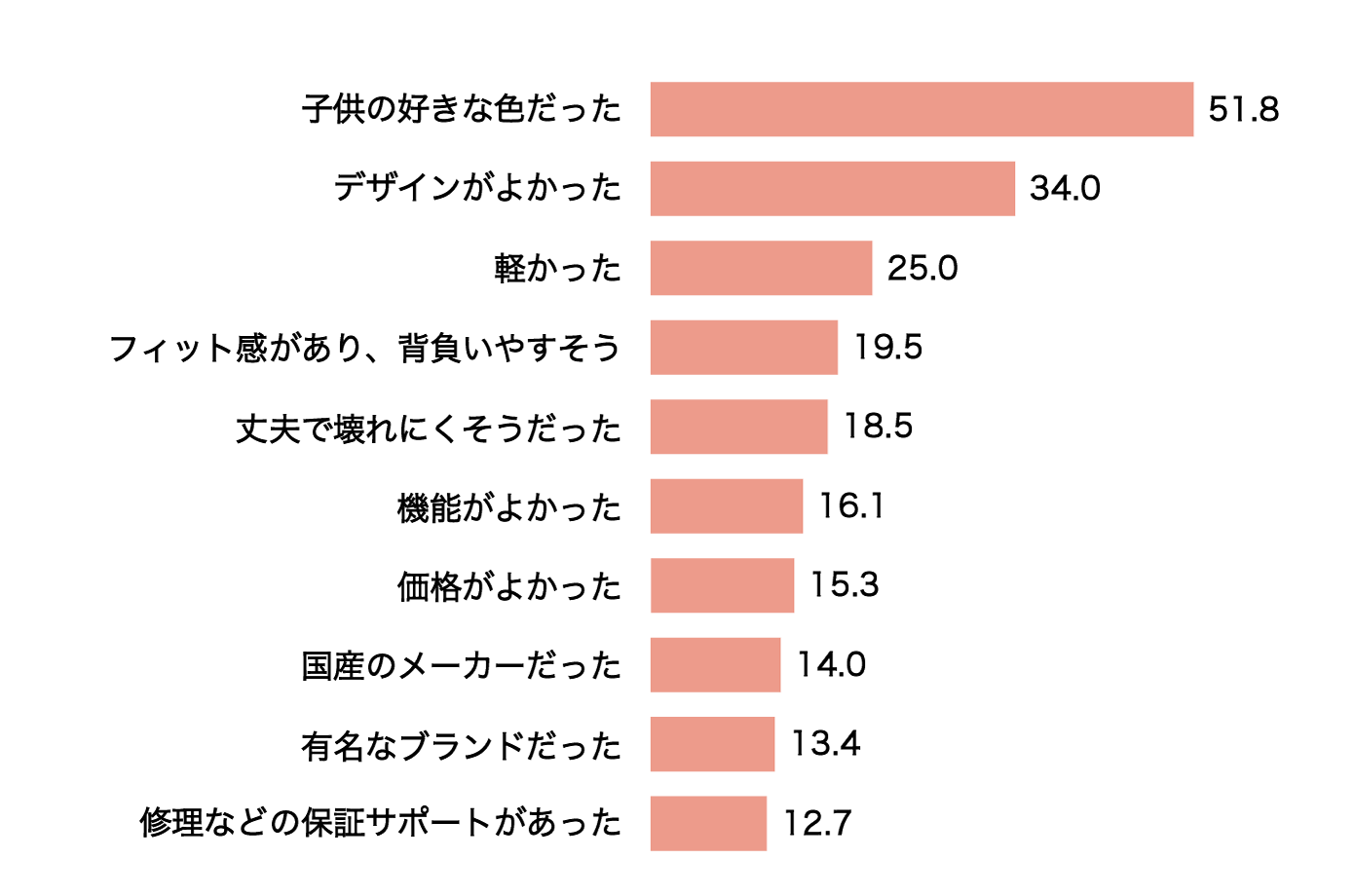 購入前・購入後の両者で意識されていたのは例年の調査と同様に「子どもの好きな色かどうか」でした。「デザイン」は検討時に丈夫さやフィット感よりも重視されないものの、購入理由としては「色」に次いでこちらも例年通り2位となりました。3位の「軽さ」に関しては購入時に重視される傾向があります。