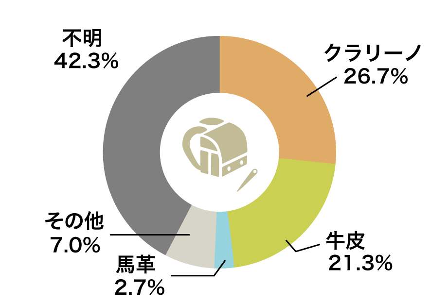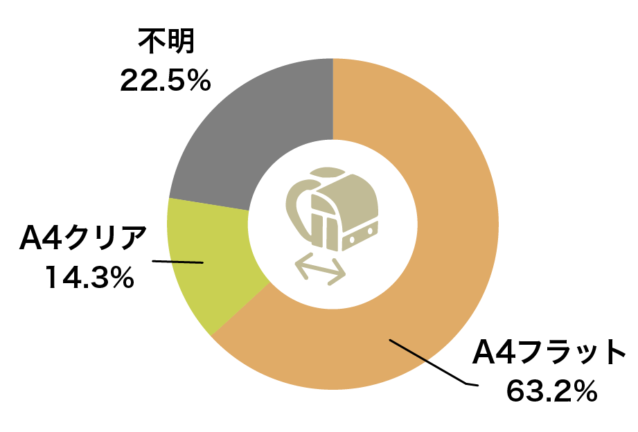 サイズでは、前年同様「A4フラットサイズ」が大多数となりました。素材については、「クラリーノ」が約27%と減少傾向にあります。「牛皮」天然素材(牛革・馬革)は21%と前年から微増。「よくわからない」が約42%と年々増加しています。