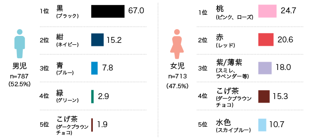 男児では、「黒(ブラック)」が67%にのぼり、「紺(ネイビー)」(15%)と合わせると80%を超えていました。