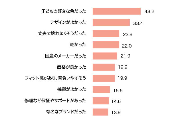 購入前・購入後の両者で意識されていたのは「子どもの好きな色かどうか」でした。また、「丈夫で壊れにくい」といった観点も重要なポイントだと考えられていることがわかります。