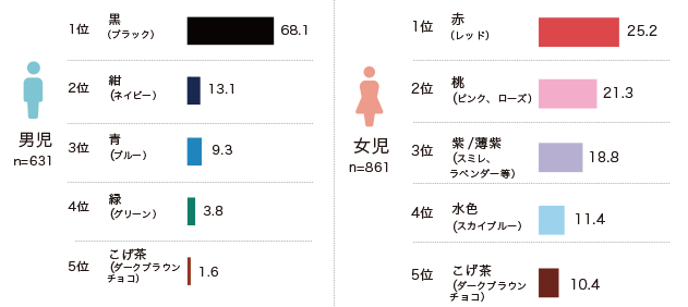 男児では、「黒(ブラック)」が68%にのぼり、「紺(ネイビー)」(13%)と合わせると80%を超えていました。