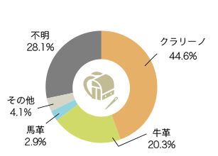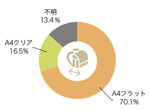 サイズでは、「A4フラットサイズ」が70%と大多数を占めていました。素材については、44%がクラリーノで、牛革が20%と続いています。