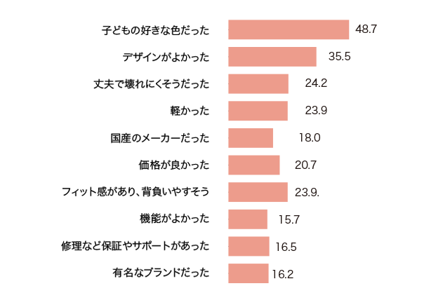 購入前・購入後の両者で意識されていたのは「子どもの好きな色かどうか」でした。また、「丈夫で壊れにくい」といった観点も重要なポイントだと考えられていることがわかります。