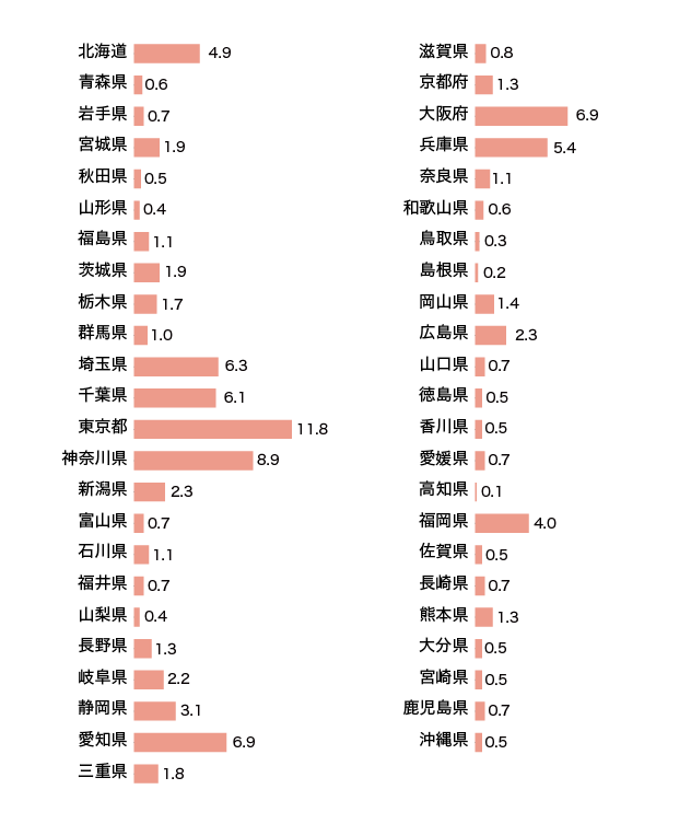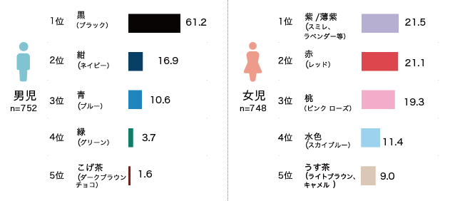 男児では、「黒(ブラック)」が2020年の70.0%から61.2%と8.8%減っていました。「紺(ネイビー)」は4.3%、「青(ブルー)」は2.0%、「緑(グリーン)」は0.4%増加しています。
