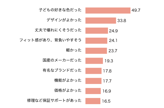 購入前・購入後の両者で意識されていたのは引き続き「子どもの好きな色かどうか」でした。また決定理由としては「デザイン」が重視されていたことがわかります。